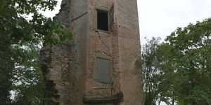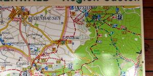 Letzte Ruhe vor dem Sturm, und schon ging`s los, immer aufwärts am Schloßberg. Bis wir den Bergfried erreicht hatten waren über 100 Höhenmeter gemeistert. Vorbei an den vorerst letzten Weinbergen bogen wir auf den „Keltenerlebnisweg“ ein, identisch mit dem „Steigerwald-panorama-weg“. Vorbei am „Tränksee“ nahe dem Örtchen Wüstenfelden liefen wir immer am Kamm des herbstlich gefärbten Steigerwaldes bleibend die nächsten 2,5 Stunden bis zum Friedrichsberg. Die eine oder andere Rast nutzten wir für einen Blick in die Ferne: Schweinfurt und ganz schwach die Rhön und der Spessart wurden erahnt. Letzter Halt war das Jagdschloß der Rüdenhäuser Castellfamlie mit dem benachbarten Waldgasthaus „Zum goldenen Rehlein“, erstellt laut Ausleger im Jahre 1744. Leider seit 10 Jahren ist dies geschlossen.