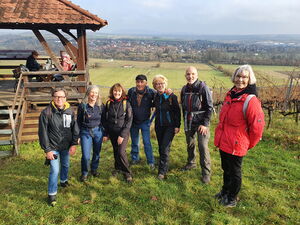 Am Sonntag, den 14.11. machten sich sieben Naturfreunde und Gäste auf den Weg zum Römerhof bei Kitzingen. Dort startete unsere heutige Tour bei bewölktem Wetter in Richtung Sulzfeld der Traumrundenbeschilderung entlang. Nach einem kurzen Streifen der Ortsgrenze wechselten wir auf den Kulturwanderweg "Reben - Rettich - Renaissance" in die Weinlage Maustal. Kurz vor Segnitz ging es über die Weinberge in Richtung Weinhalla. Dort wurden wir mit einer schönen Aussicht und einem schöne Sonnenhimmel belohnt. Über einen kurzen steilen Abstieg erreichten wir wieder Sulzfeld. Hier folgte eine ausgiebige Rast, bei der sich jeder stärken konnte. Über die Weinlage Cyriakusberg führte nun der Rückweg zum Römerhof. Es war eine tolle Wandertruppe mit vielen schönen interessanten Gesprächen unterwegs. Insgesamt wuden 22 km zurückgelegt.